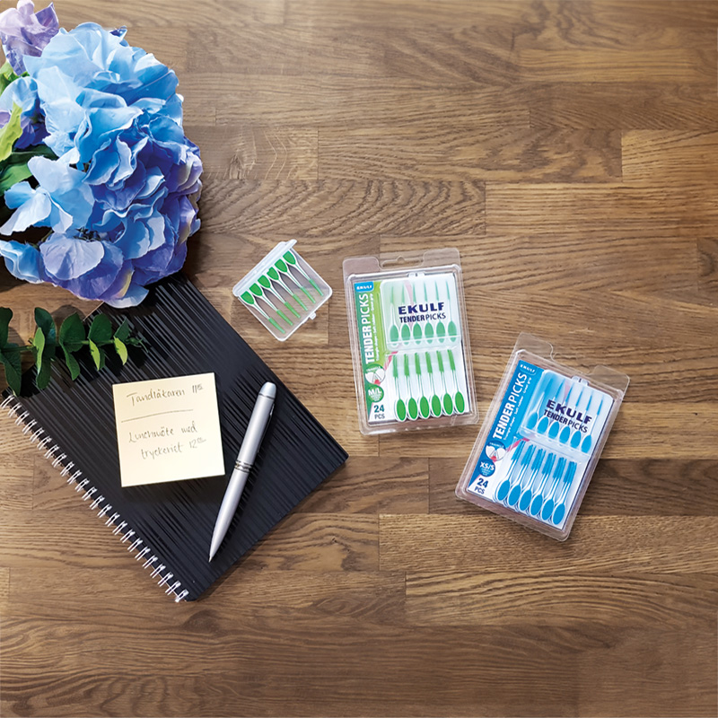 EKULF TenderPicks är en blandning mellan en vanlig tandpetare och en mellanrumstandborste. Tandstickan är triangelformad och böjbar med mjuka gummifilament för en skonsam rengöring. Handtaget har en gummerad yta för bästa möjliga grepp. Varje förpackning levereras med 24 st tandstickor och ett smidigt reseetui med plats för sex stycken tandstickor så att du enkelt och hygieniskt kan ta med dem under dagen.