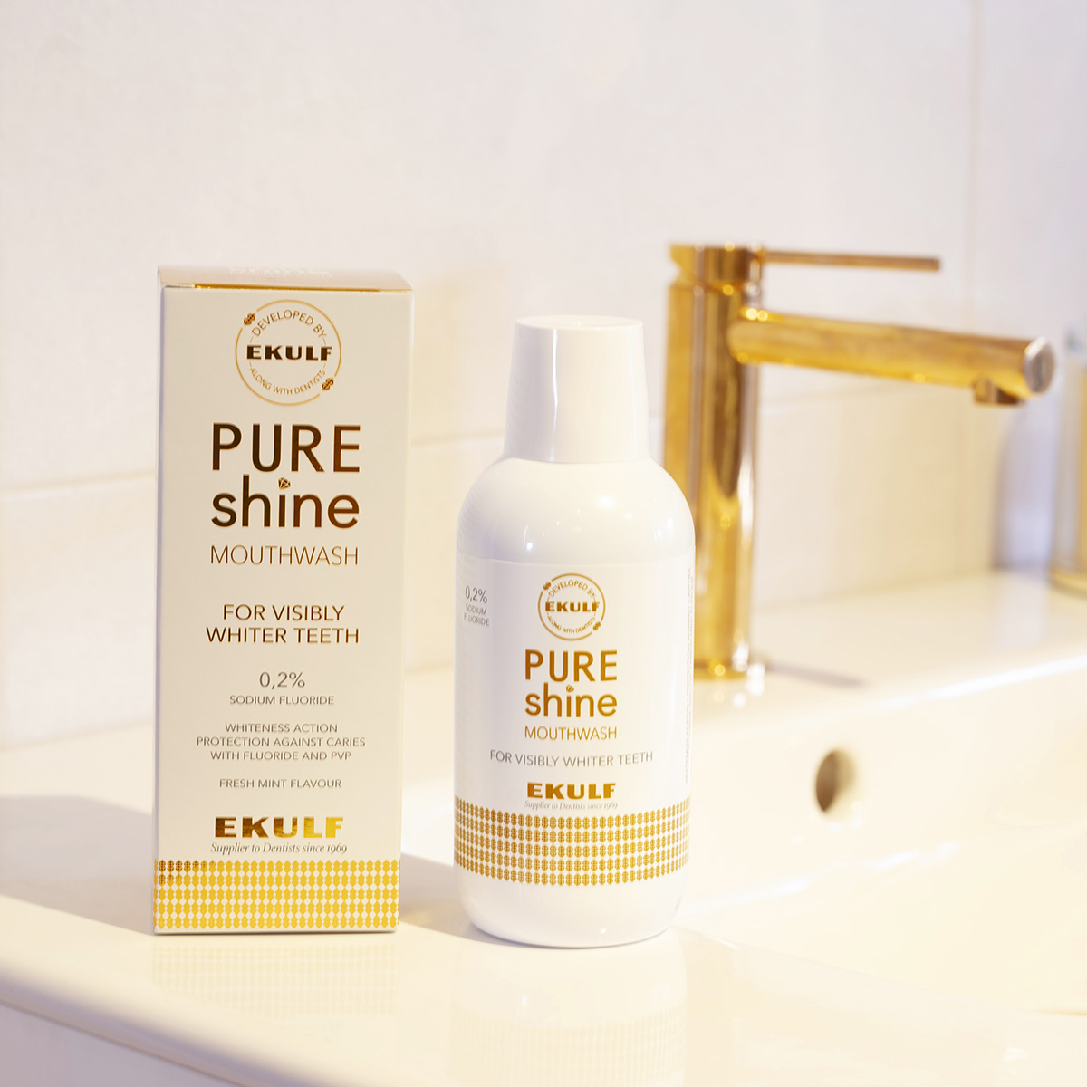 PUREshine Mouthwash är ett fluorbaserat munskölj utvecklat för att stärka emaljen, motverka karies och hjälpa till att bevara tändernas naturliga vita färg – utan att skada tandytan. Med en unik kombination av aktiva ingredienser, där PVP (Polyvinylpyrrolidone) effektivt motverkar plack och beläggningar, hjälper PUREshine till att hålla tandytorna rena och minska missfärgningar.